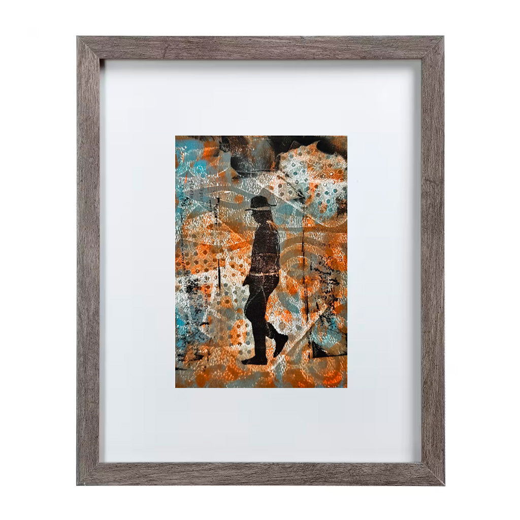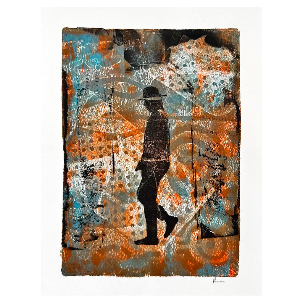 Layers of earthy brown, black, and hints of teal merge into a captivating silhouette in this one-of-a-kind Gelli print art piece. Crafted by pressing paint onto a flexible gel plate and transferring it to paper, the Gelli print technique creates organic textures and spontaneous patterns that can never be duplicated, making this artwork a single, irreplaceable creation.