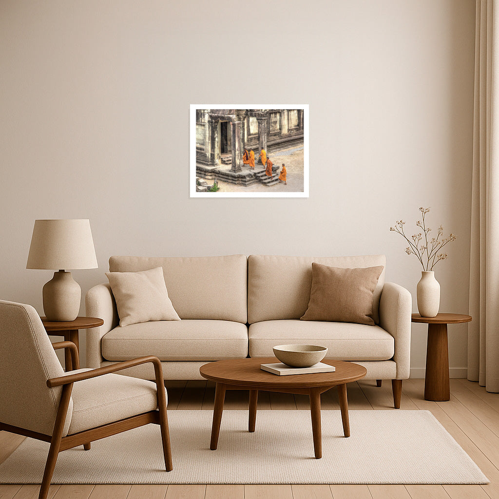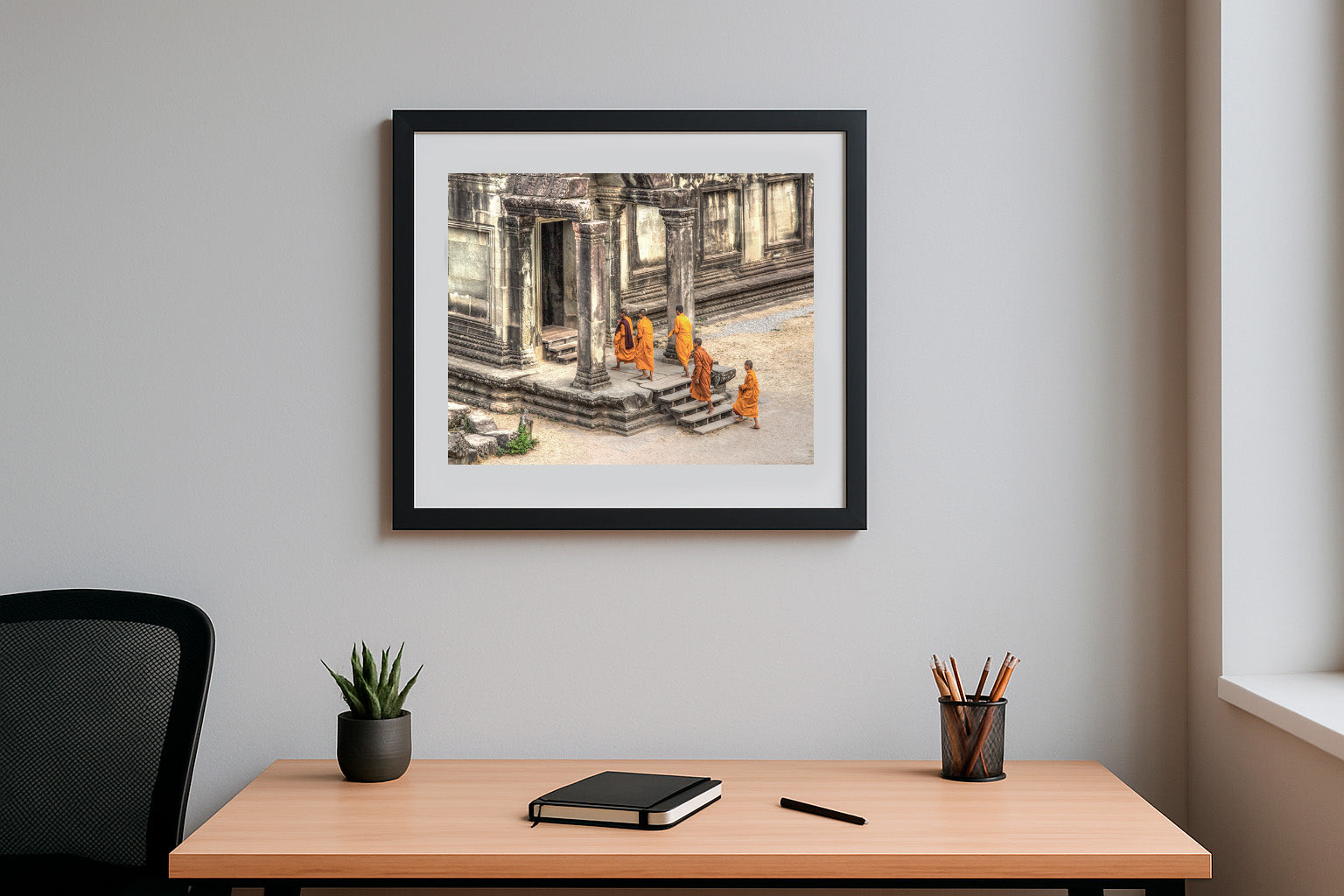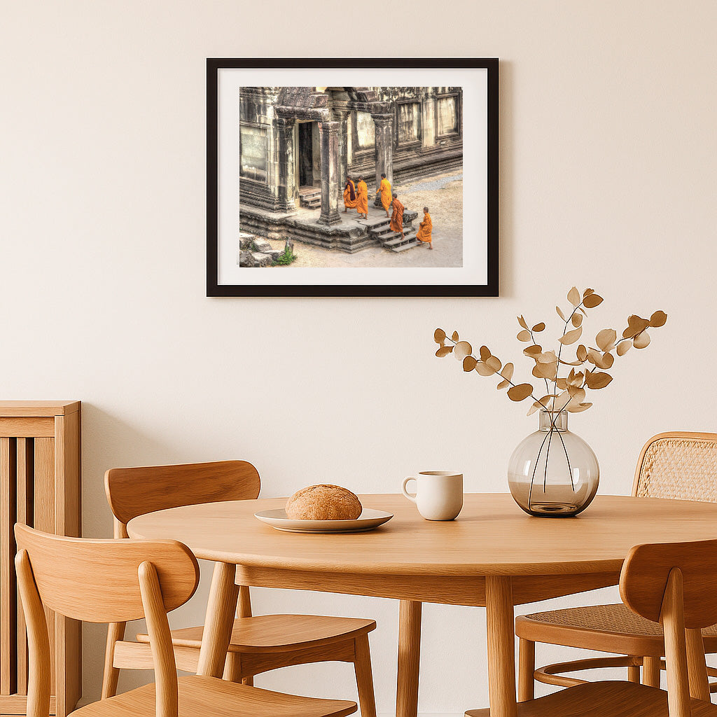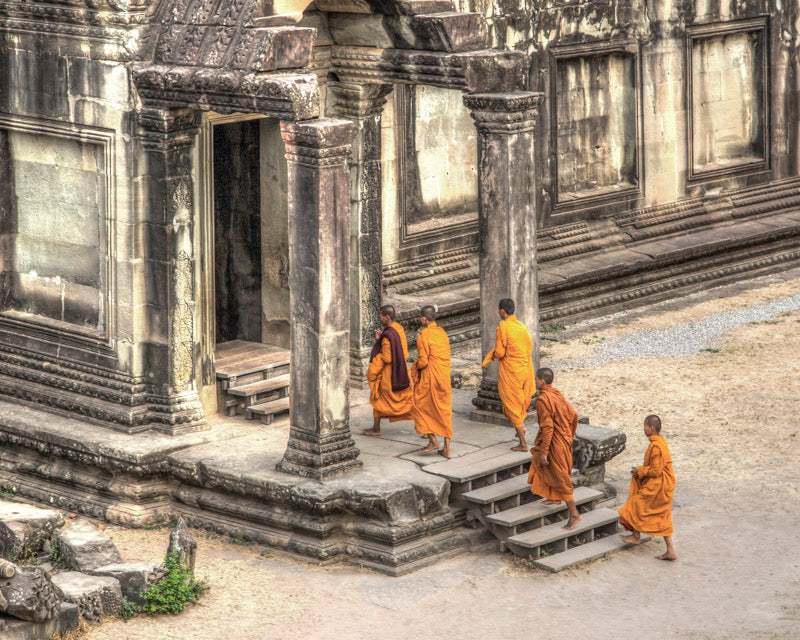 Bathed in the soft glow of morning light, monks in vibrant orange robes ascend the ancient steps of a revered temple. Their silent procession weaves a story of dedication and unity, set against the backdrop of weathered stone that has witnessed countless generations. Each movement is a graceful echo of spiritual pursuit, infusing the sacred space with a sense of purpose and timeless tranquility.