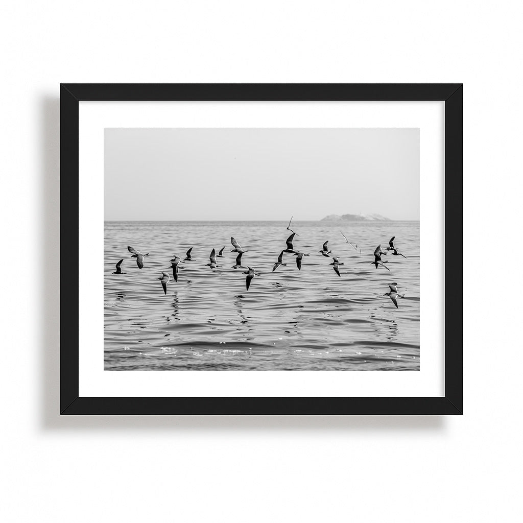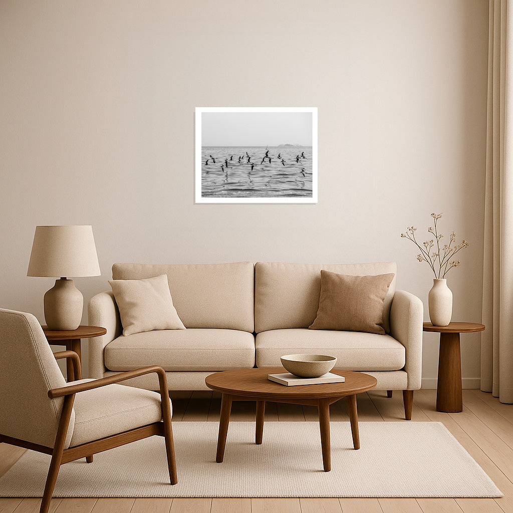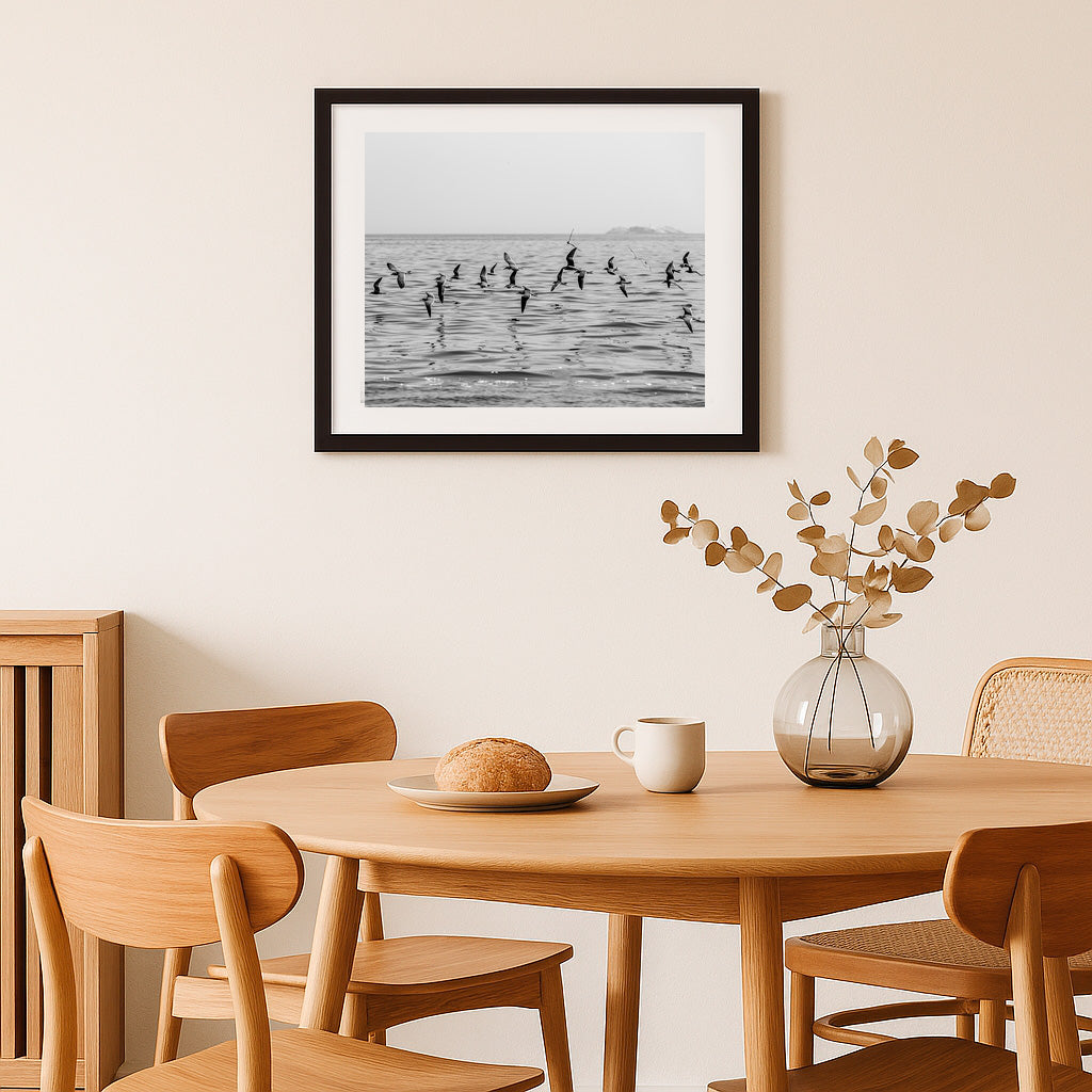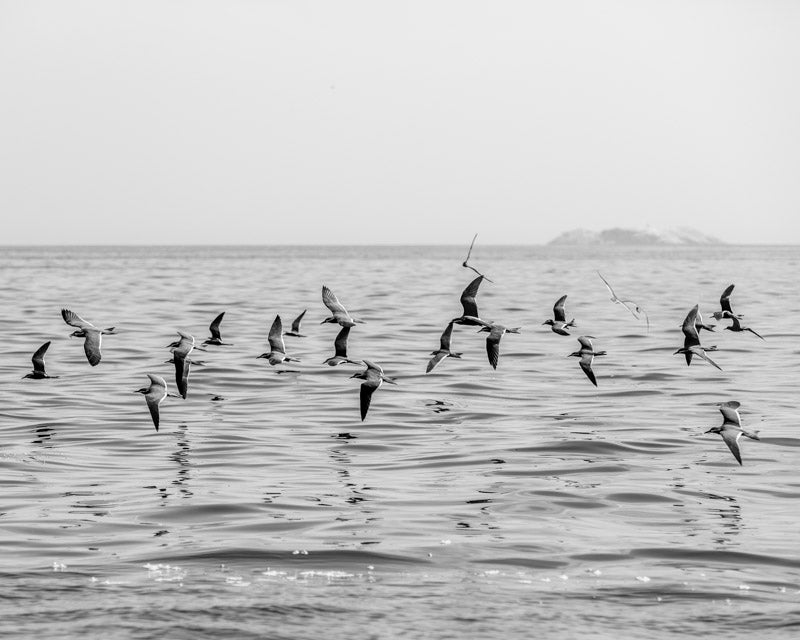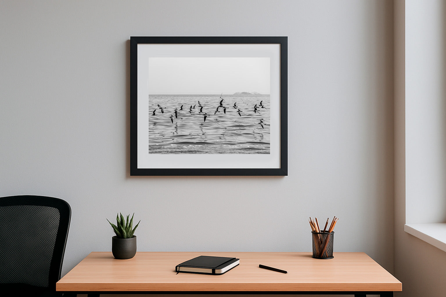 A seamless ballet unfolds above the water as a flock of birds sweeps across the calm sea, their wings cutting through the air in perfect unison. The black-and-white tones highlight the elegance of their movement, while the distant island hints at journeys yet to come. This moment captures the quiet power and collective spirit of nature, where every bird plays its part in a larger, harmonious dance.