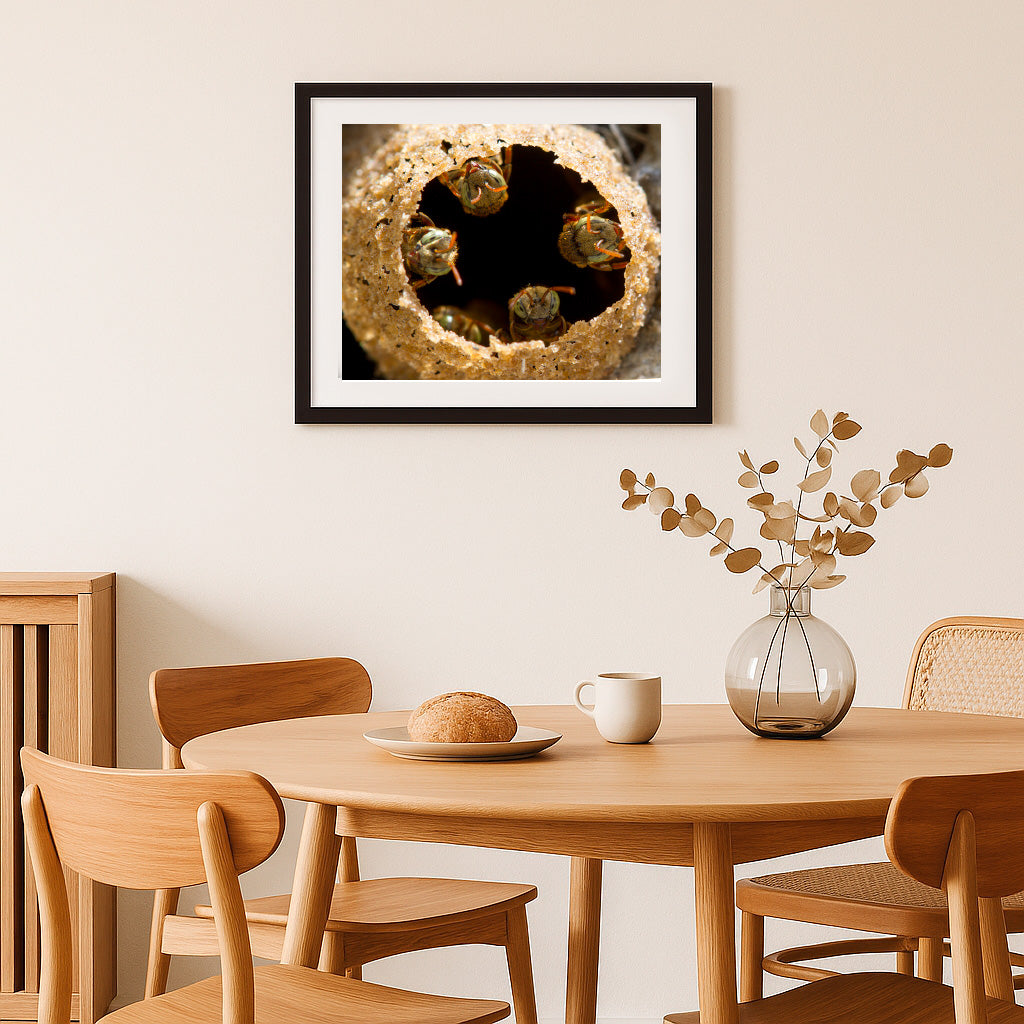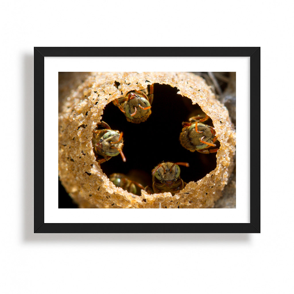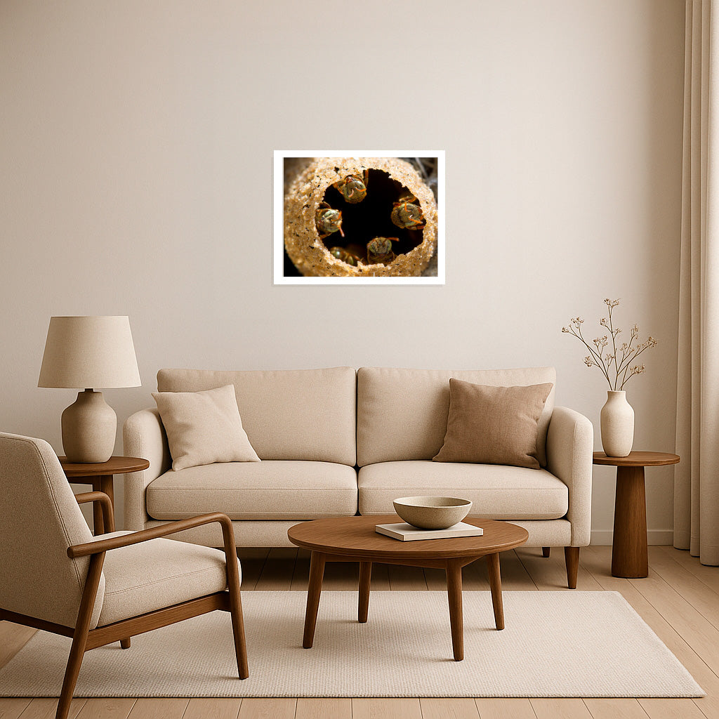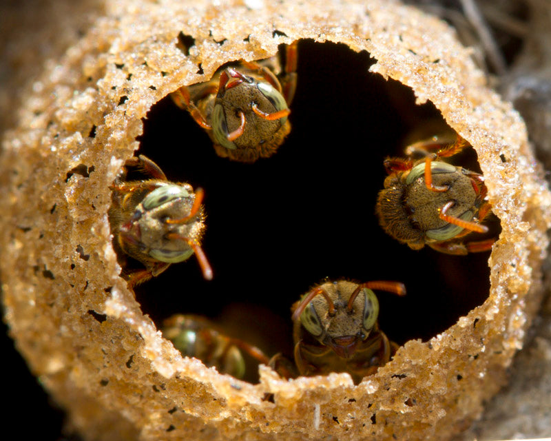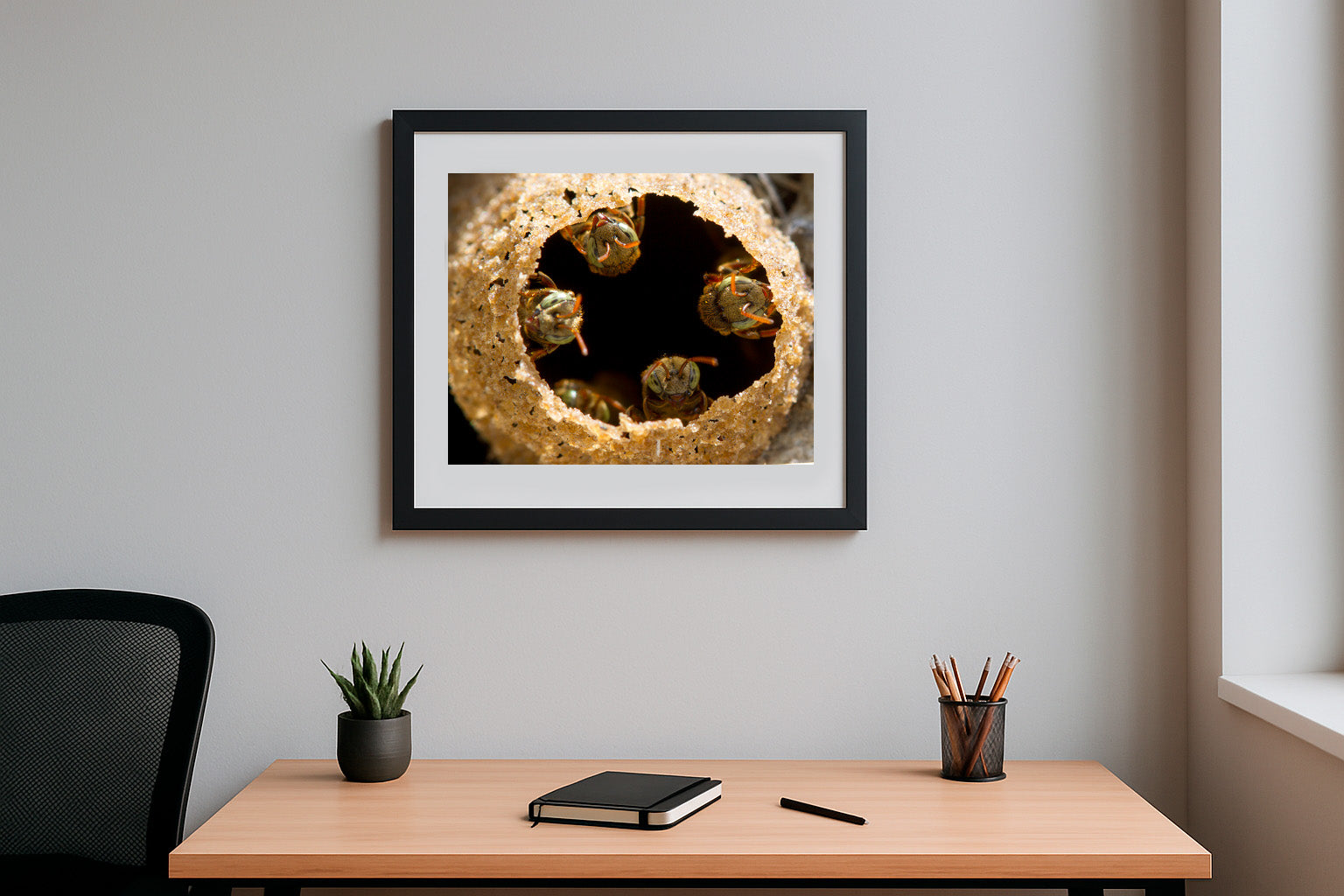 Nestled within the delicate architecture of their waxy home, a cluster of stingless bees peers out from the entrance, their luminous eyes alert and curious. The intricate tunnel, crafted from countless grains, glows softly in the light, framing the tiny sentinels as they stand watch over their colony. Each bee’s antennae and fuzzy face hint at the complex social world hidden just beyond the threshold. This intimate glimpse into their hive reveals the quiet diligence and unity that sustain their miniature society, celebrating the marvels of nature’s smallest architects.