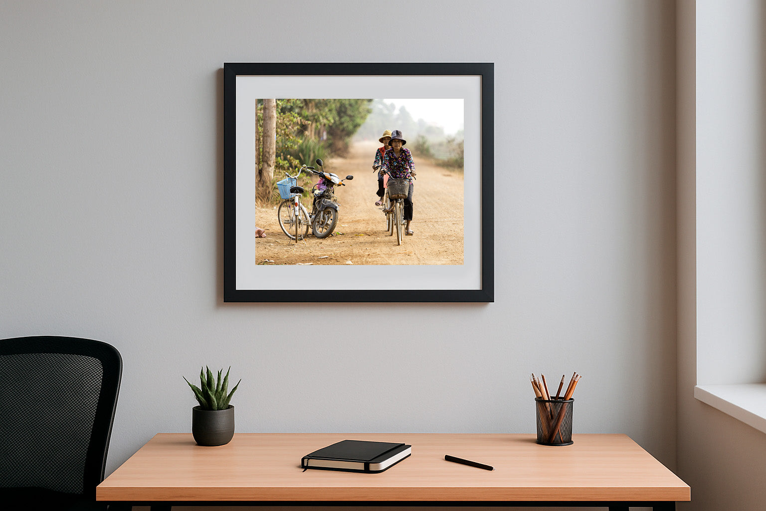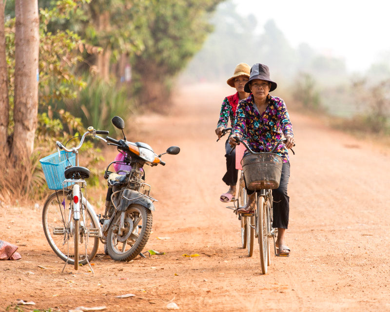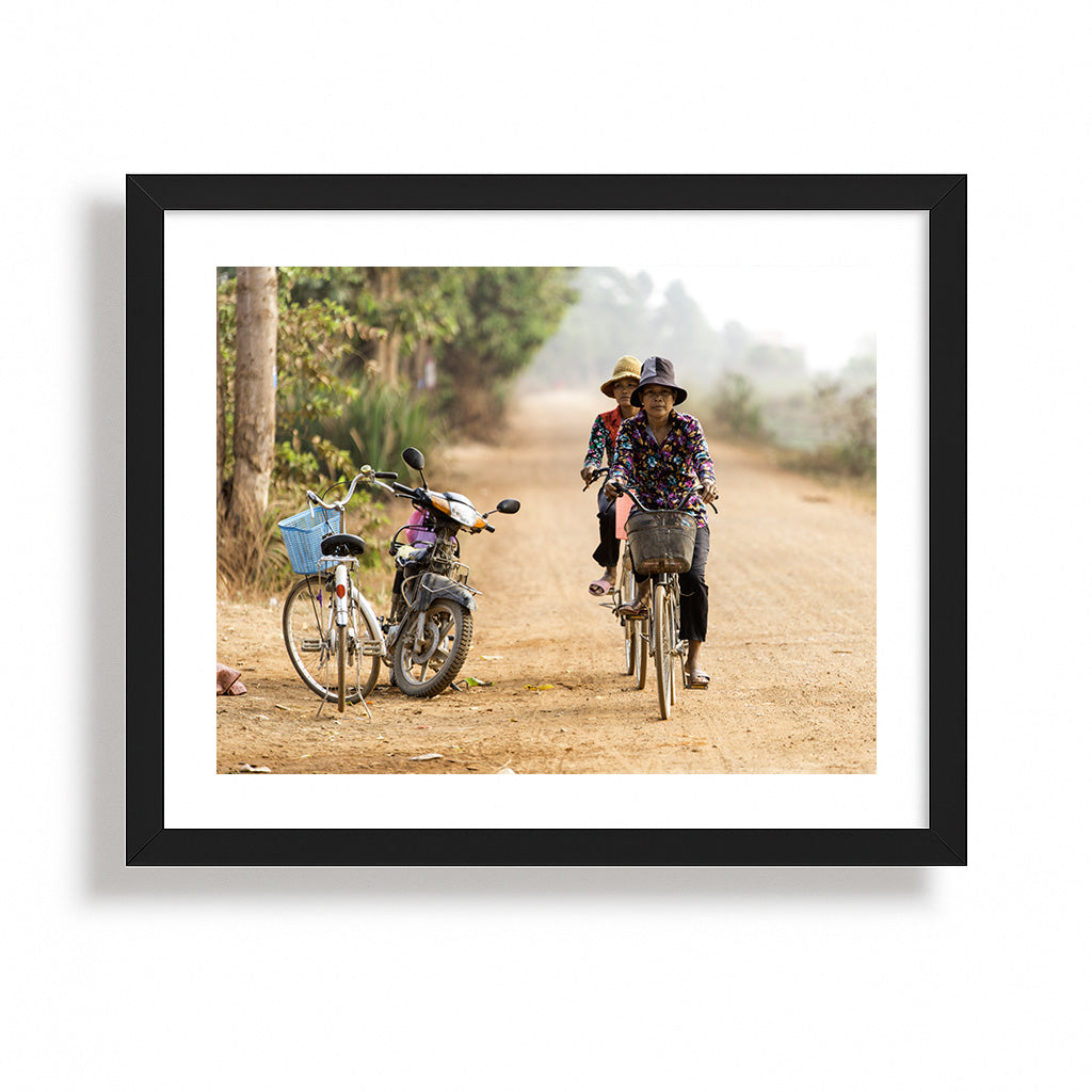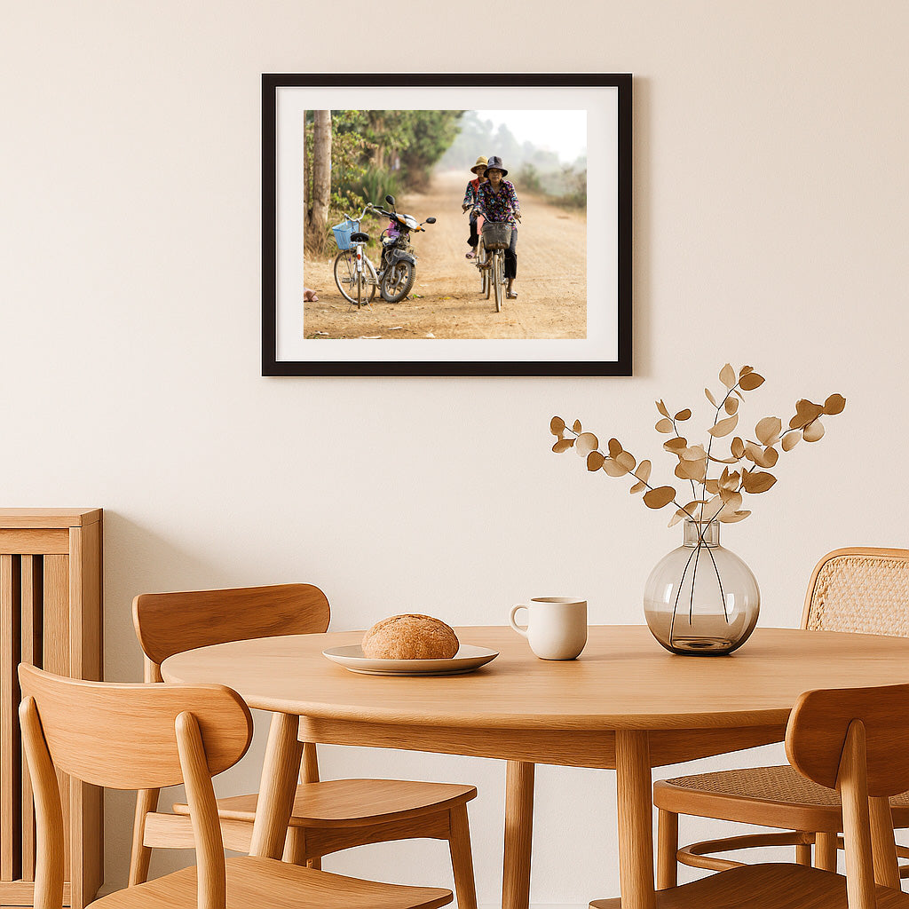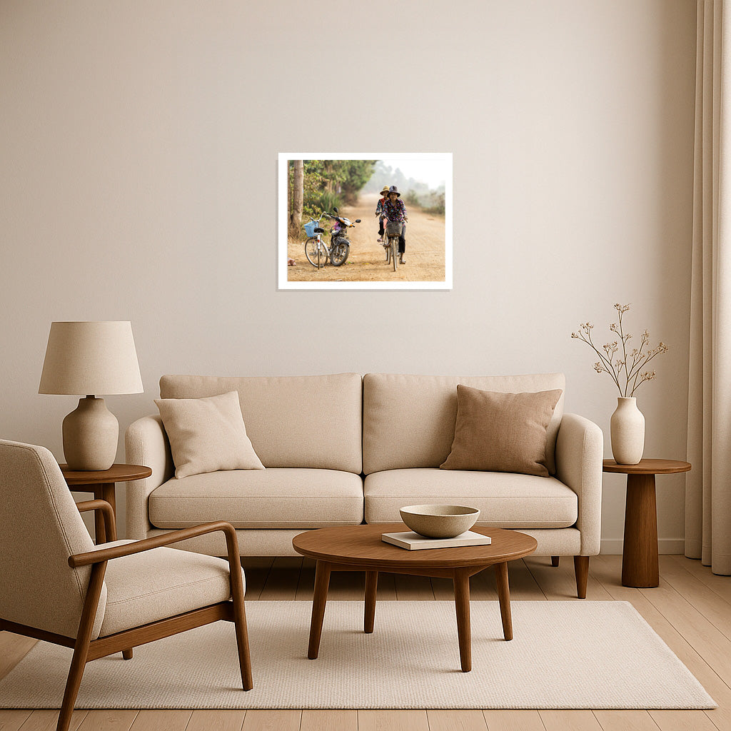 On a sun-drenched country lane, two women glide effortlessly on their bicycles, their floral shirts vivid against the earthy tones of the path. Parked casually to the side, a weathered motorbike and a white bicycle with a blue basket hint at the blend of tradition and progress in rural life. The scene captures a tranquil moment of daily routine, where the journey is as meaningful as the destination, and the quiet camaraderie of shared travel weaves through the gentle dust of the road.