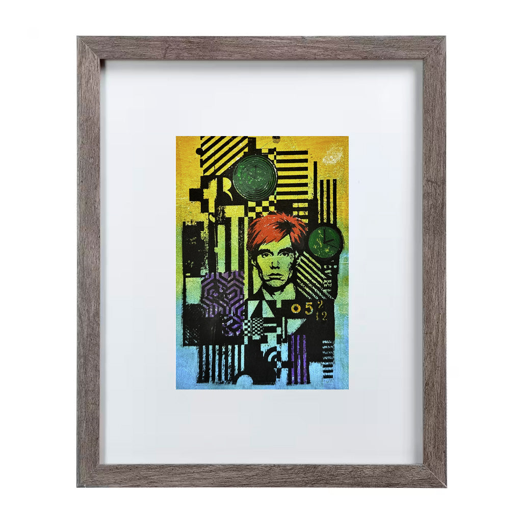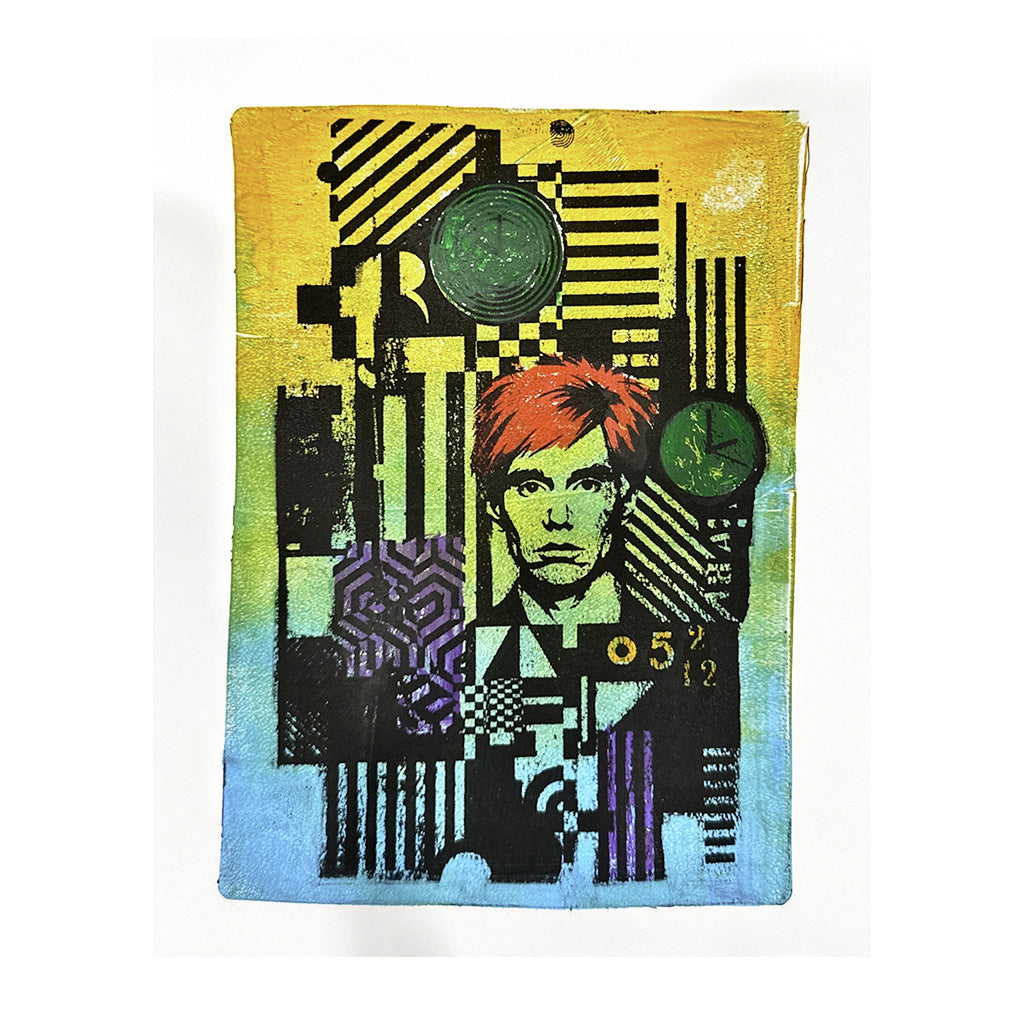 "Pop Time Code" fuses pop iconography with graphic abstraction in a burst of vivid shapes and layered textures, where the sharp stare and red hair draw instant attention amid clocks and geometric forms. This one-of-a-kind piece owes its singularity to the gelli print technique, a creative process in which paints and stencils are pressed onto a silicone-based gelatin plate and only one print is lifted before the composition is forever changed. Each gelli print showcases unpredictable blends of color and form, ensuring that no two artworks are ever the same—a celebration of the unrepeatable moment captured in every layer.
