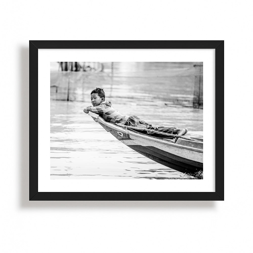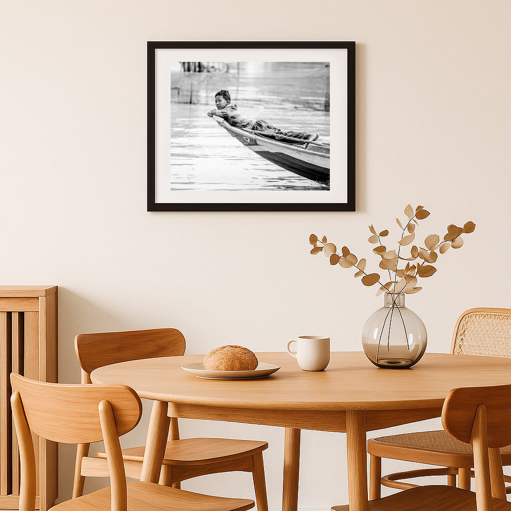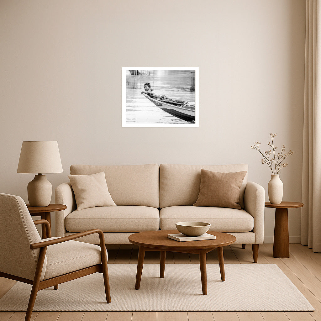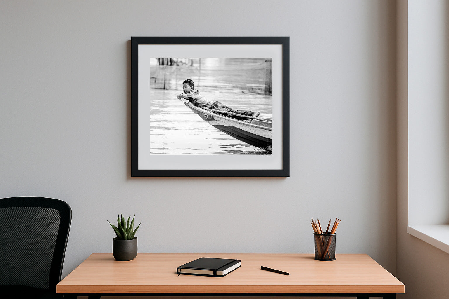 Stretched out on the prow of a wooden boat, a young figure finds a rare moment of peace above the gentle ripples of the river. Striped sleeves and loose trousers echo the relaxed posture, as bare feet dangle just above the water’s surface. The monochrome tones amplify the mood of quiet contemplation, capturing the simplicity and freedom of a day spent afloat. In this serene scene, the world seems to slow, allowing the soft sounds of water and the gentle sway of the boat to become the only companions.