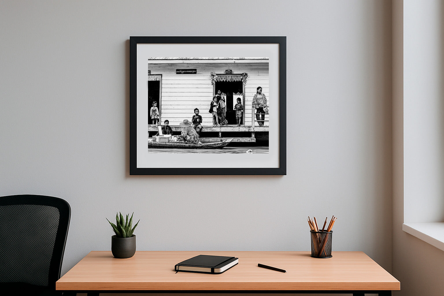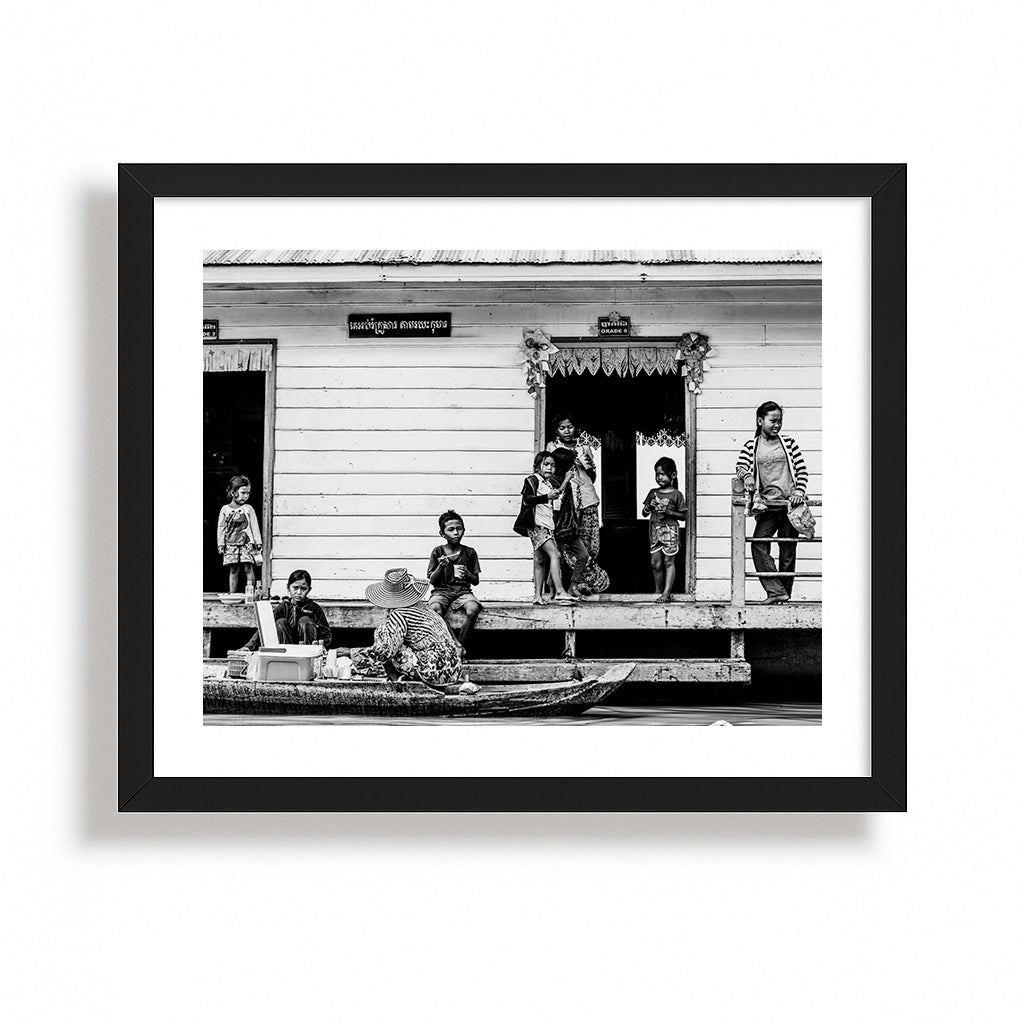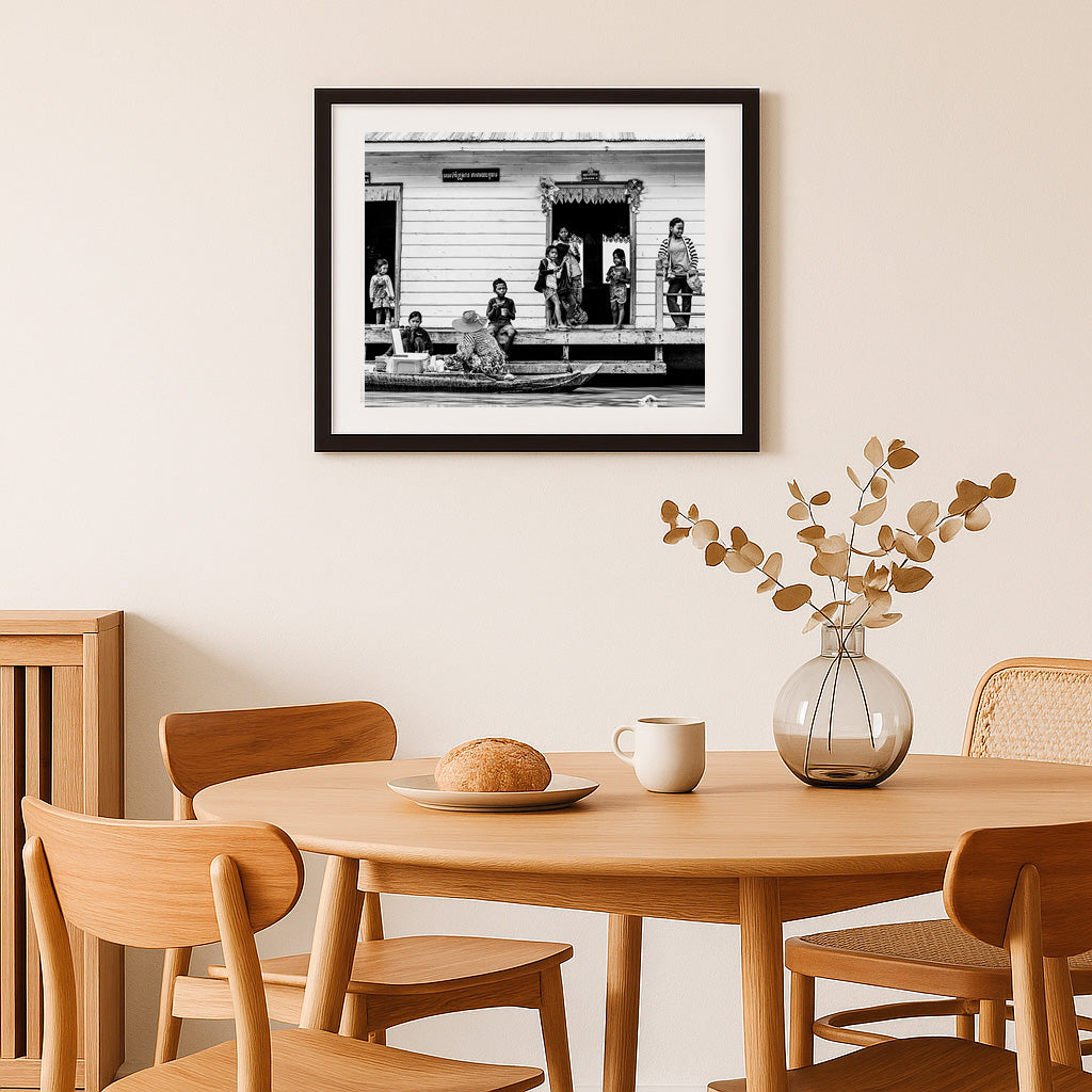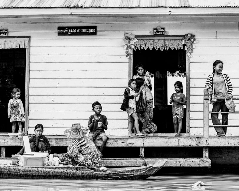 On the edge of a weathered wooden schoolhouse, children gather in anticipation, their laughter mingling with the gentle rhythm of the water below. A woman in a wide-brimmed hat steadies her boat, offering snacks and a moment of connection to the eager students perched on the steps. The scene captures the resilience and vibrancy of a riverside community, where education and daily life flow seamlessly together, and the spirit of togetherness thrives despite humble surroundings. The photograph radiates warmth and hope, celebrating the ingenuity and unity that define this floating village’s way of life.