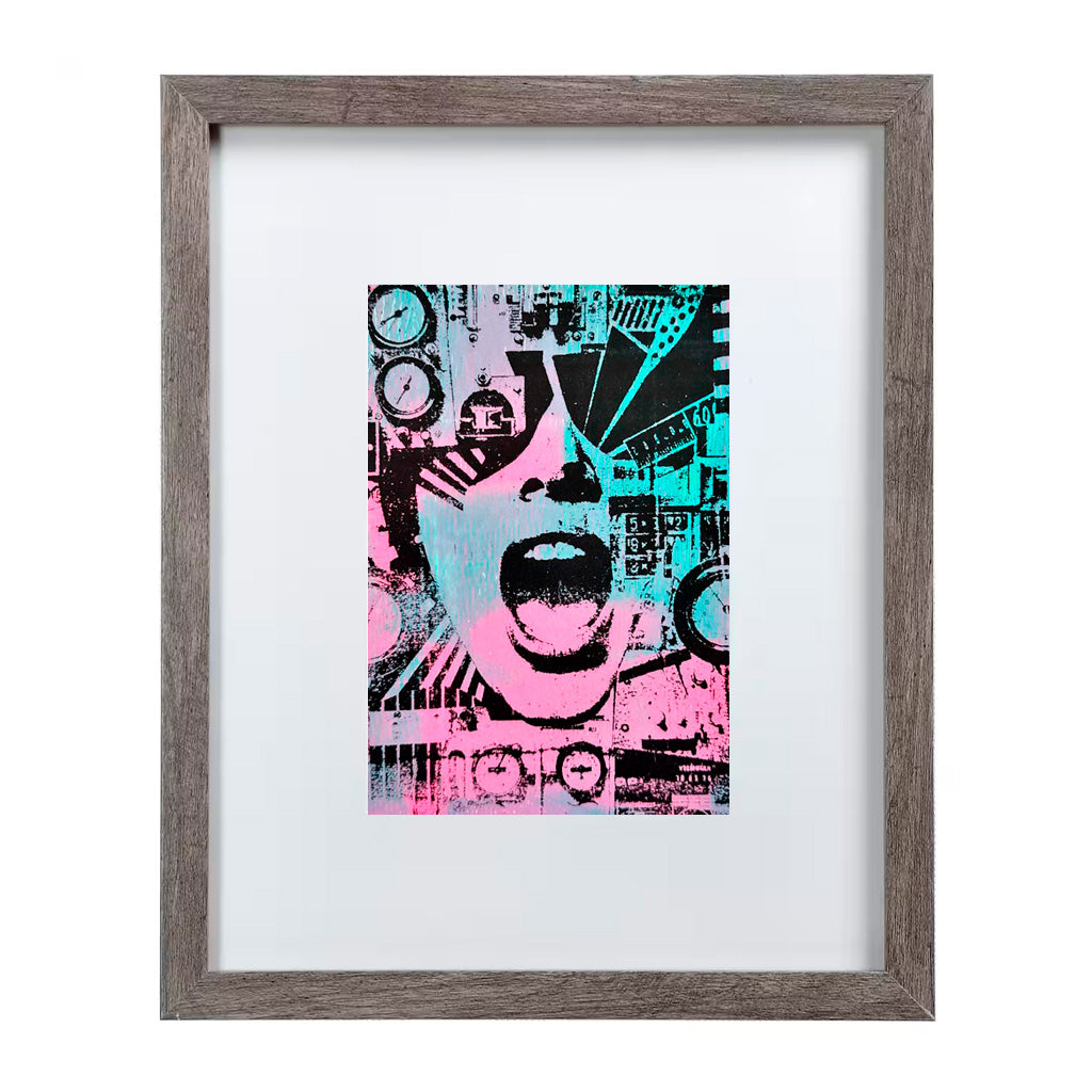 A striking burst of pink and cyan amplifies the raw emotion in this unique Gelli print, which captures a moment suspended in vibrant energy and graphic detail. The Gelli technique, where paint is spread over a flexible gel plate and pressed onto paper to produce layers of unpredictable patterns and striking textures, means this artwork is absolutely one of a kind—no two will ever be the same.