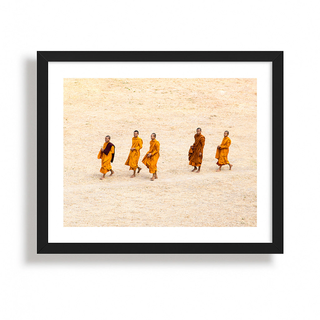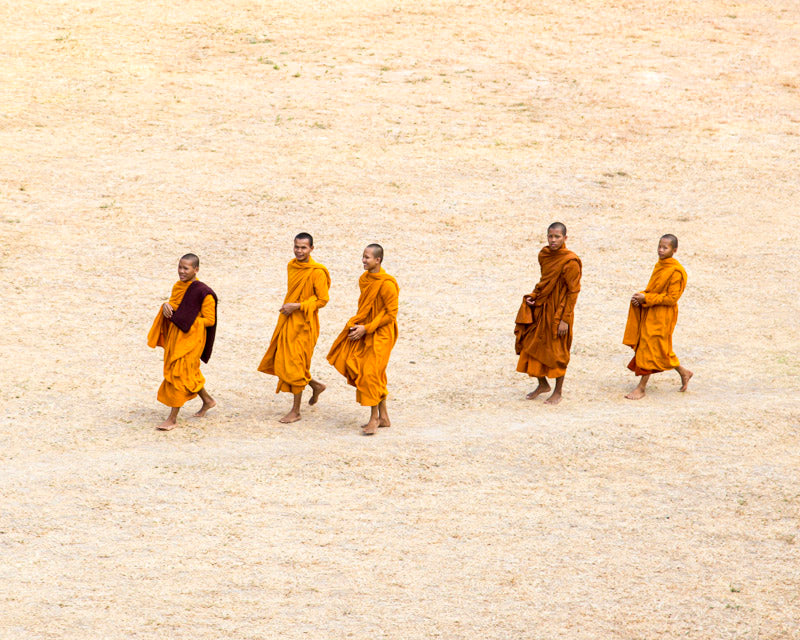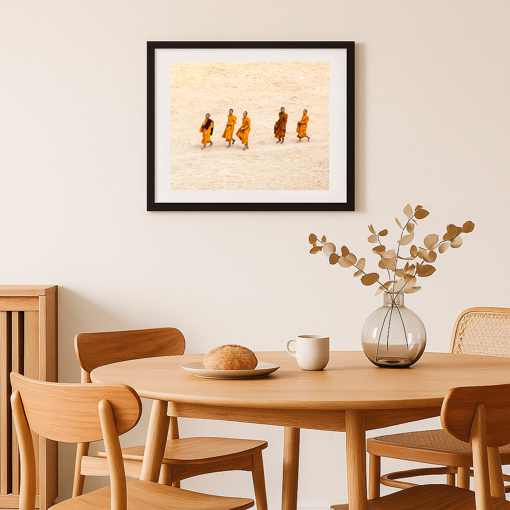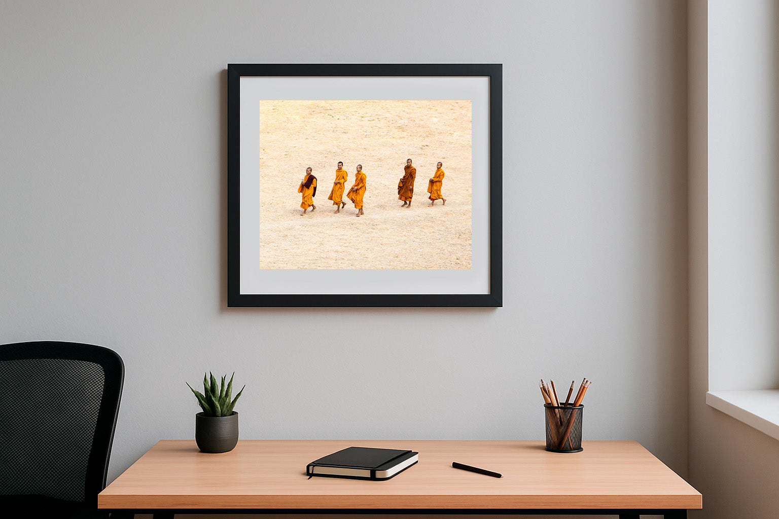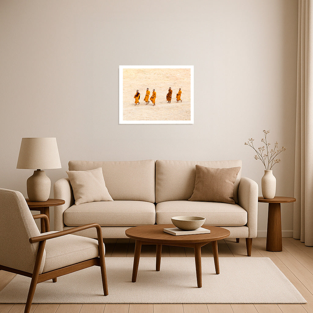 Clad in vibrant saffron robes, five monks move in quiet procession across a sunlit expanse, their presence radiating calm and unity against the simplicity of the earth-toned landscape. Each stride reflects a shared journey of discipline and mindfulness, their collective movement embodying centuries of spiritual tradition. The harmonious composition and gentle rhythm of their walk evoke a sense of peace, inviting viewers to appreciate the beauty found in purposeful movement and communal devotion.