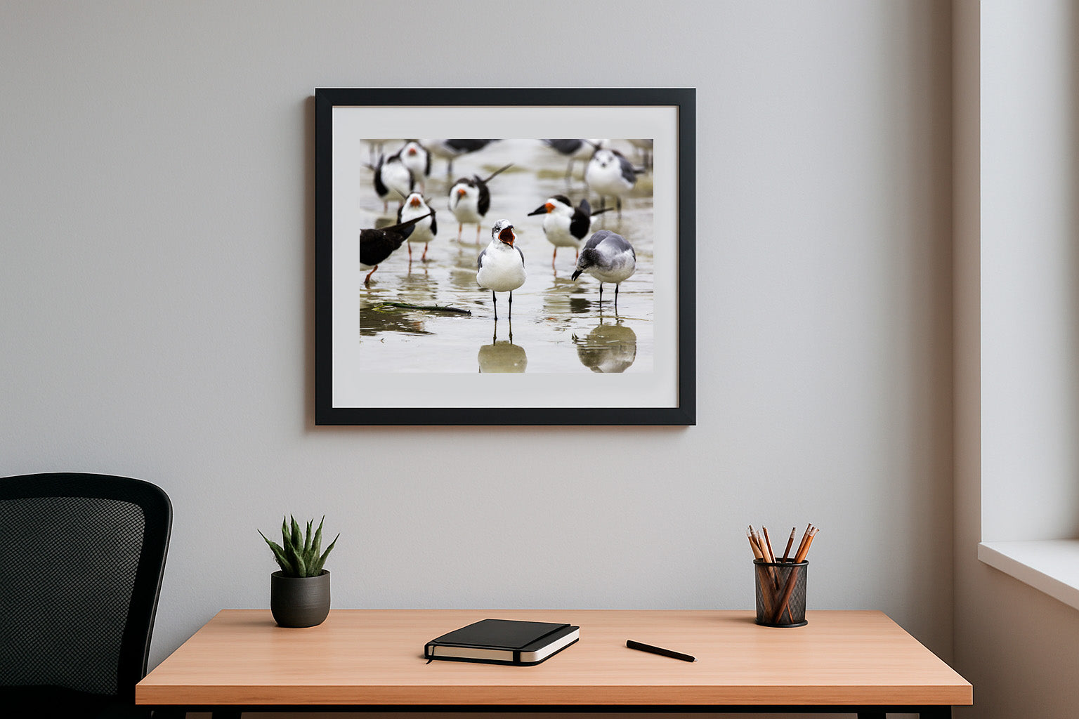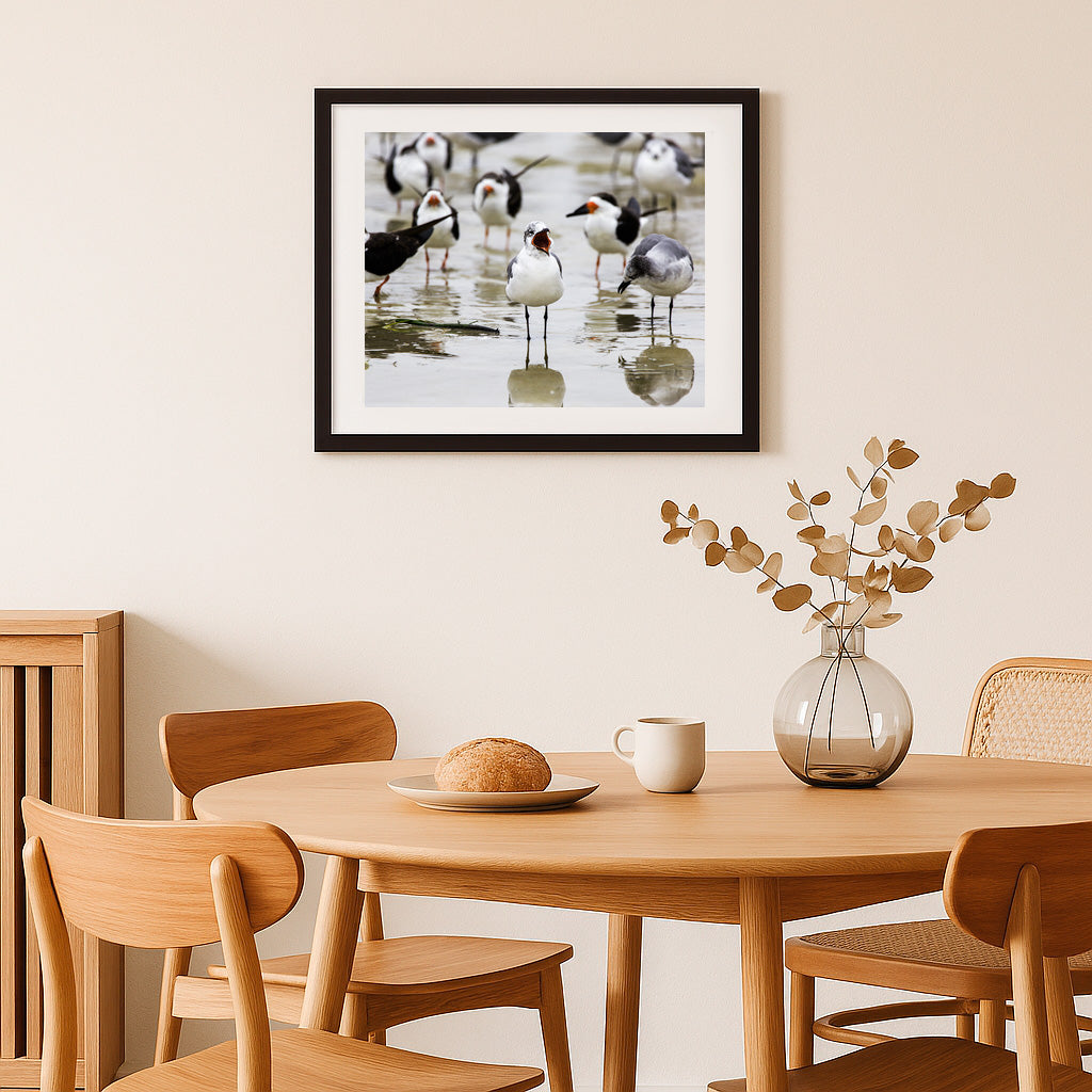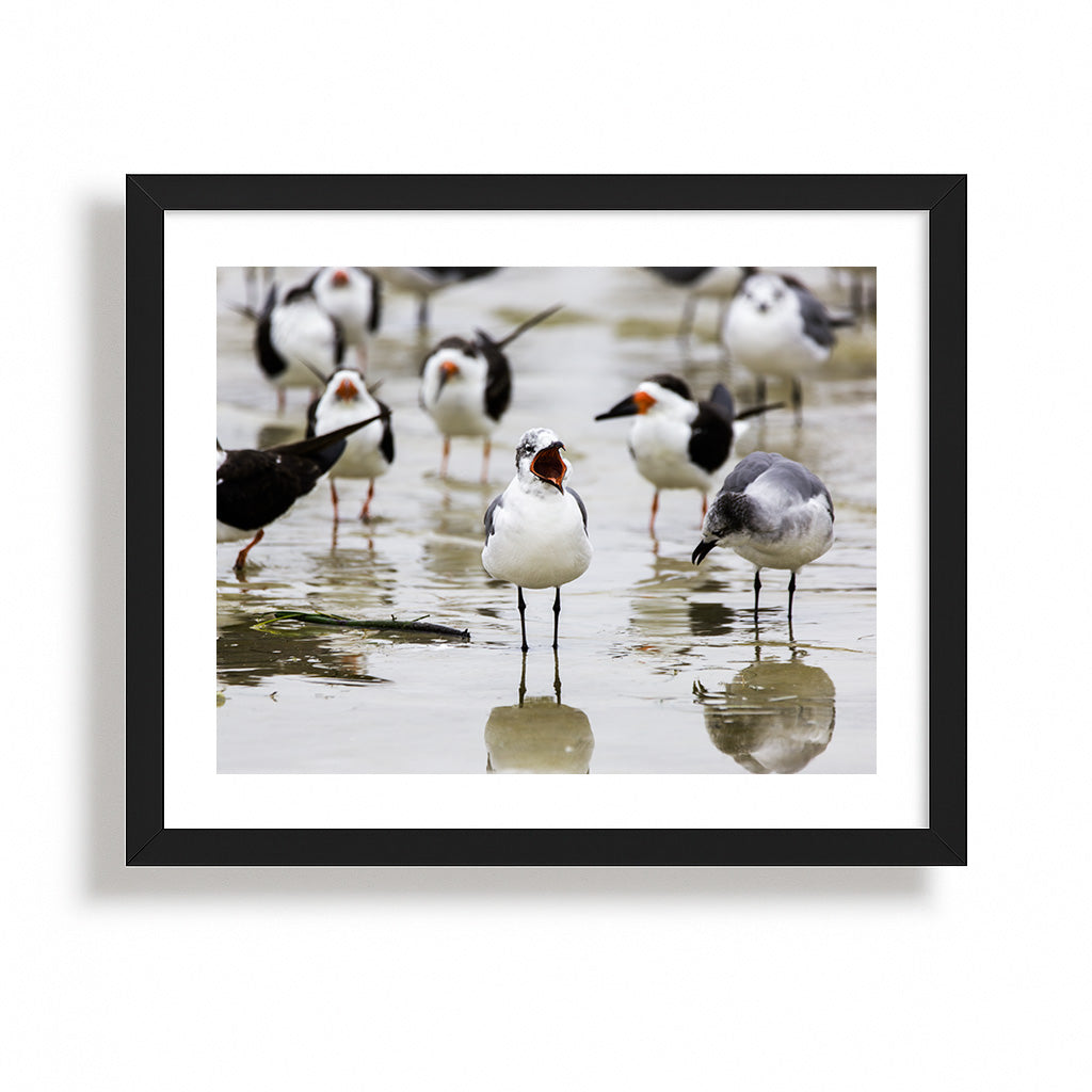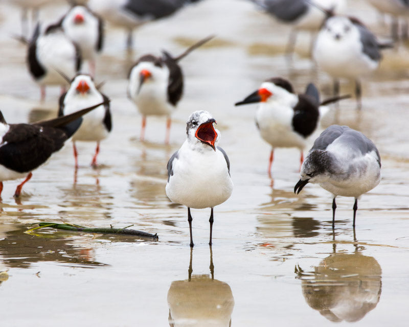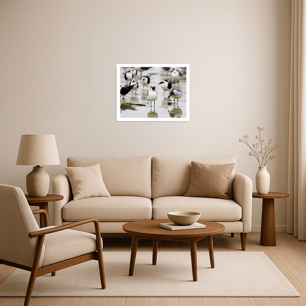 Amid the gentle wash of the tide, a lively gathering of seabirds animates the shoreline with their vibrant personalities. At the heart of the scene, one bird stands boldly with its beak wide open, as if leading the morning chorus, while its companion bows its head in a moment of quiet reflection. The blurred figures in the background, each with their own unique stance, add to the sense of community and movement, capturing the dynamic spirit of coastal life. This image celebrates the harmony and diversity found at the water’s edge, where every bird plays its part in the symphony of the sea.