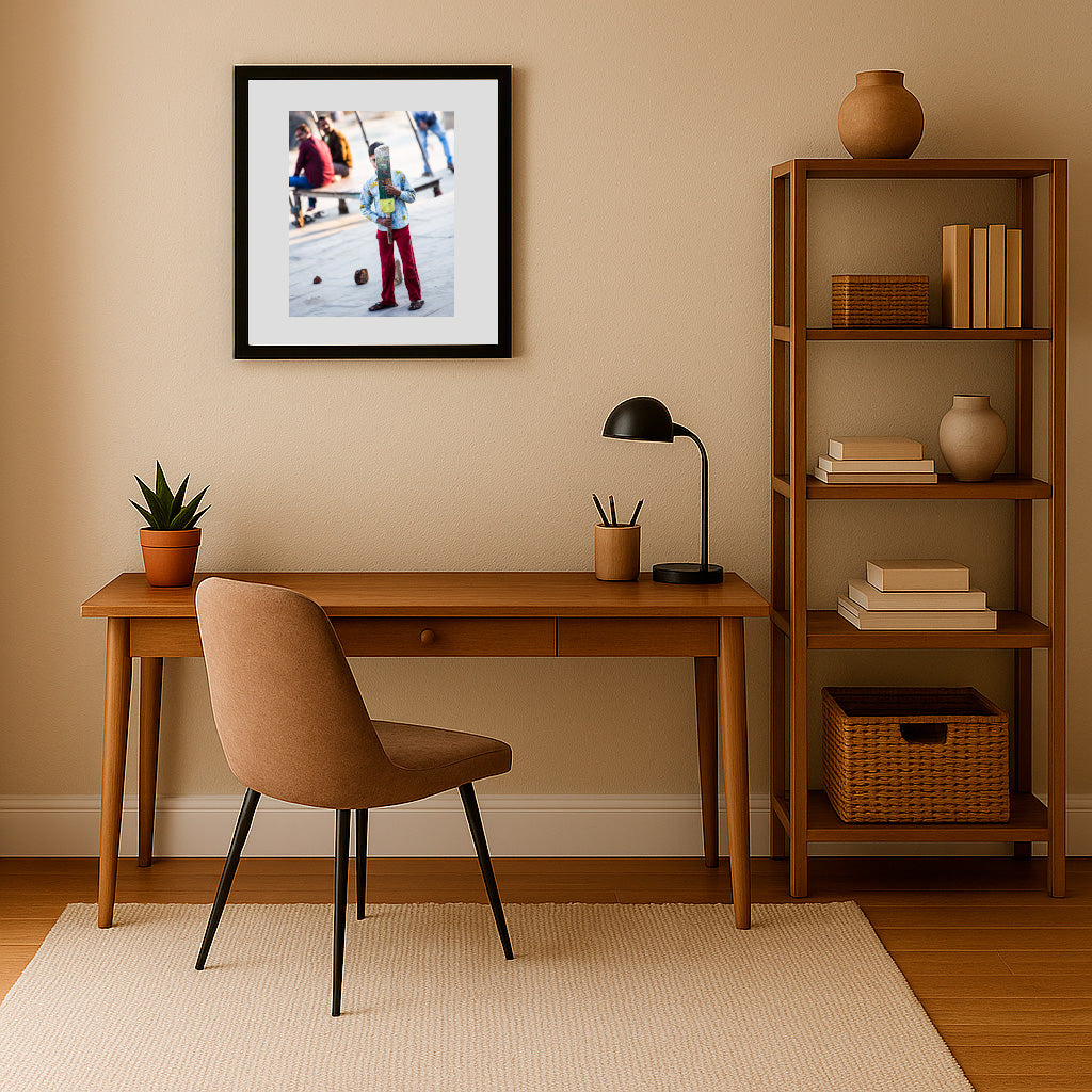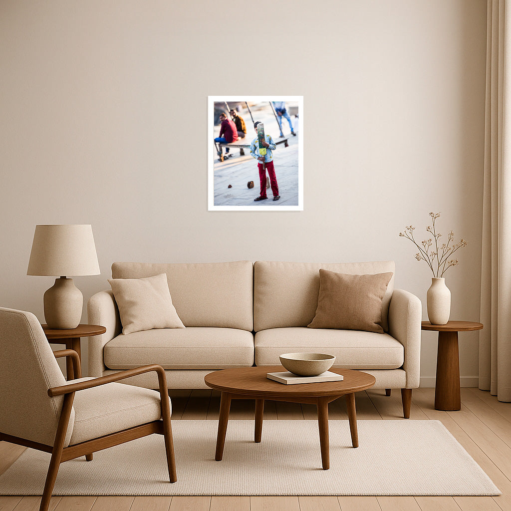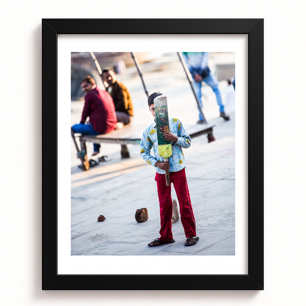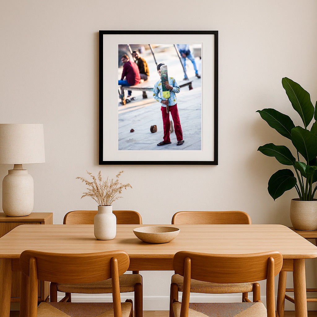 Behind a weathered, handmade cricket bat, a young boy stands poised, half-shy but wholly determined, on a sunlit street that doubles as a playground. His vibrant clothing contrasts with the faded background, framing him as the center of childhood dreams and street-side camaraderie. The blurred laughter and watchful eyes of elders in the background form a living audience, quietly cheering on their little champion. With makeshift stumps and improvised rules, this fleeting moment crystallizes the pure joy and resilience found in urban play—where every alley can become a cricket pitch and every day offers the promise of a new game.