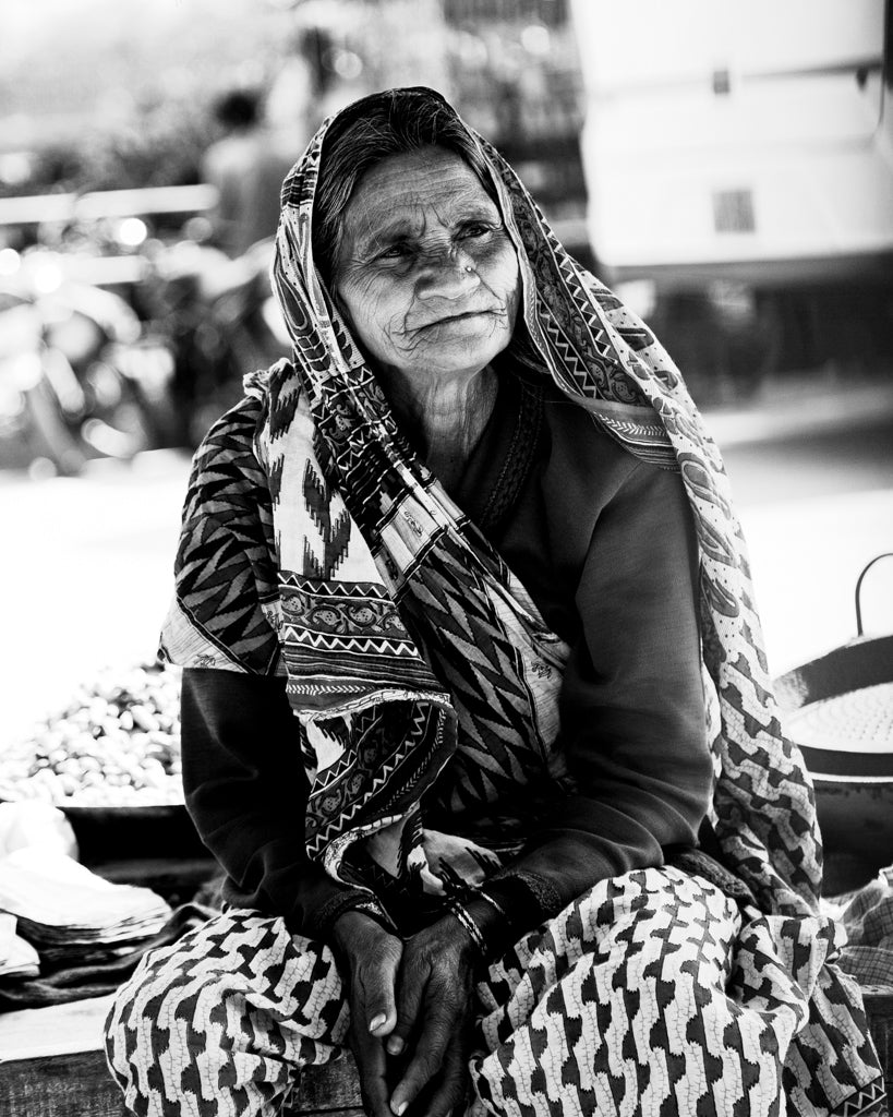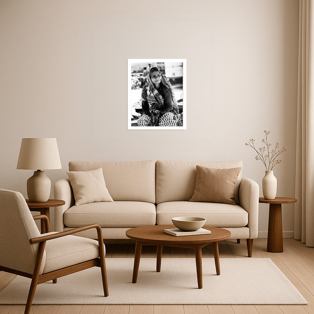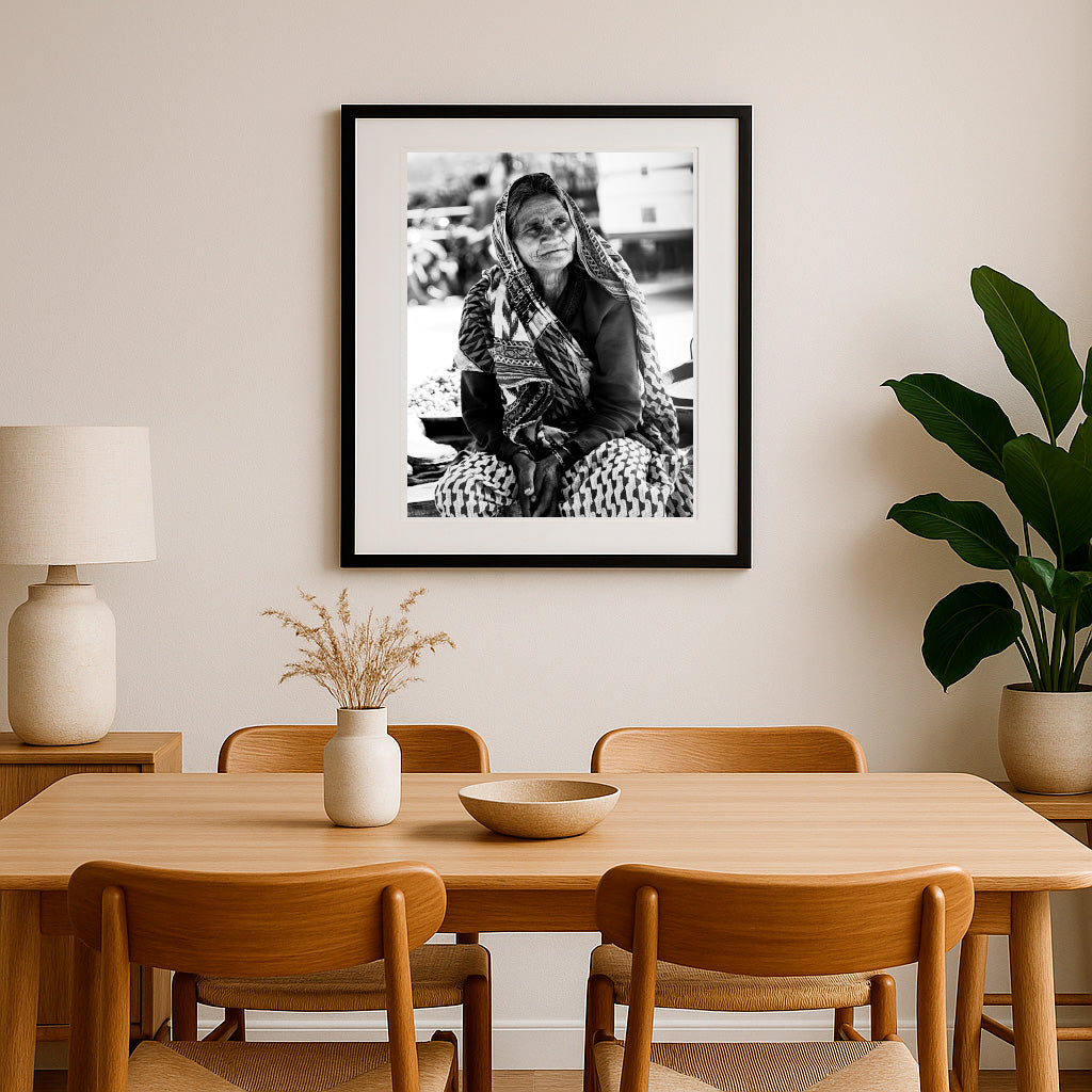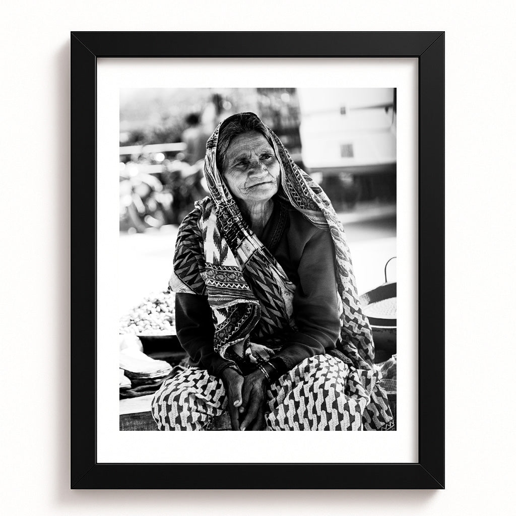 Wrapped in a tapestry of tradition, the woman’s gentle expression reveals a life woven with resilience and quiet strength. Each line upon her face echoes countless stories, her attire alive with intricate patterns that connect heritage to the present moment. Under the sunlit bustle of her surroundings, she radiates calm dignity, her hands—resting with humble poise—bearing the eloquence of years endured and joys embraced. This portrait immortalizes the beauty and grace that bloom in the folds of age, inviting admiration for the generations of wisdom encapsulated in her serene gaze.