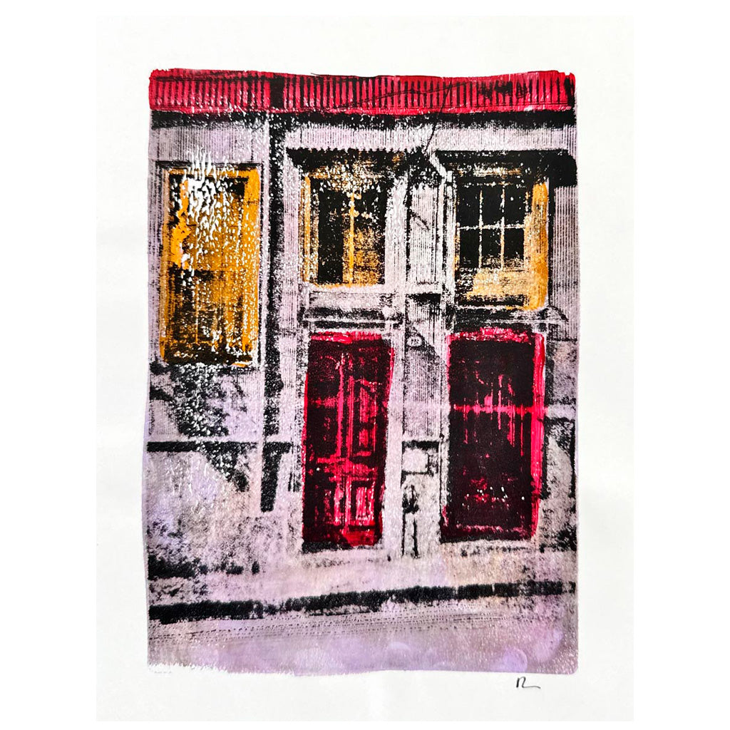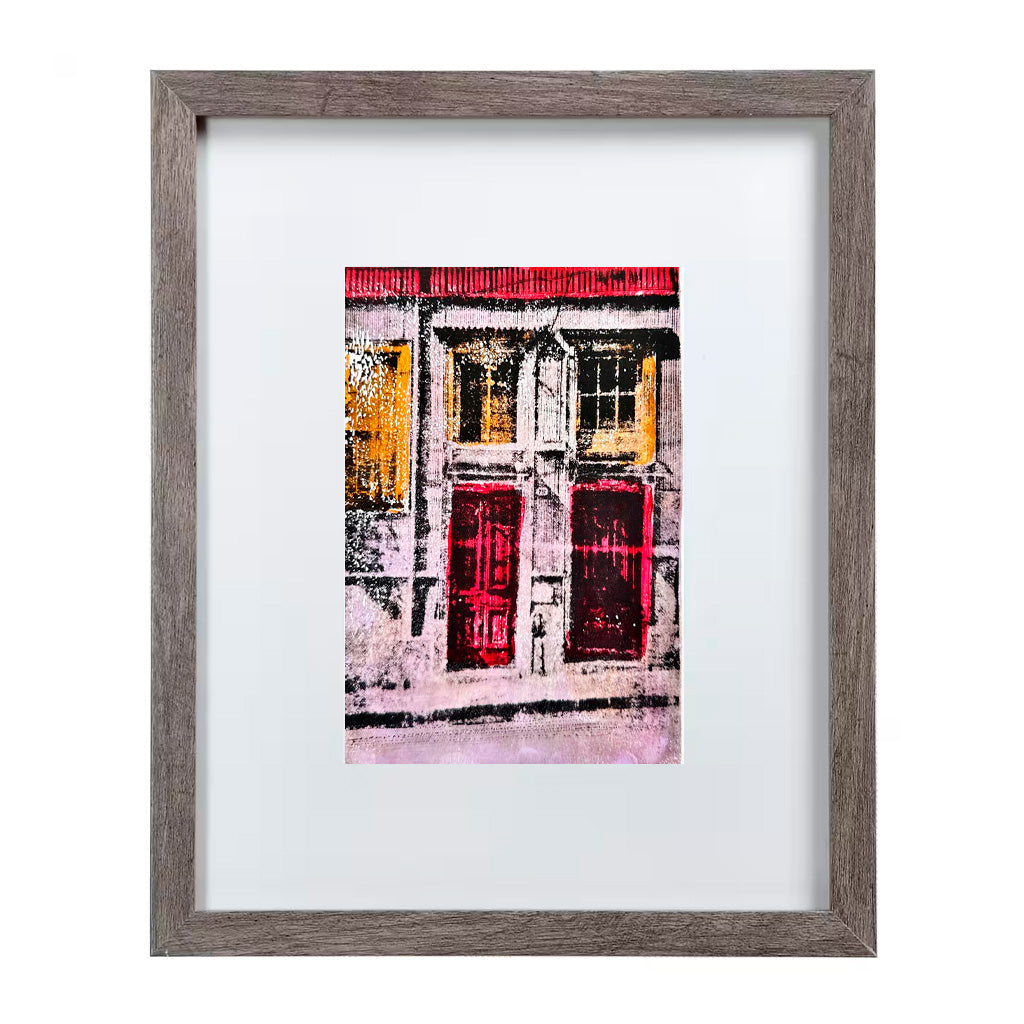"Vivid Facades" bursts with energy, drawing inspiration from the everyday charm of urban streetscapes and transforming them into something remarkable through the unpredictability of gelli printing. This technique involves rolling and pressing layers of paint onto a flexible gelatin plate, then lifting the imprint onto paper—each pass adding new depth, texture, and vibrant character. The result is a singular composition where every streak, hue, and highlight is impossible to replicate, ensuring that "Vivid Facades" is not just a picture, but a truly unique original immersed in color and tactile sensation.