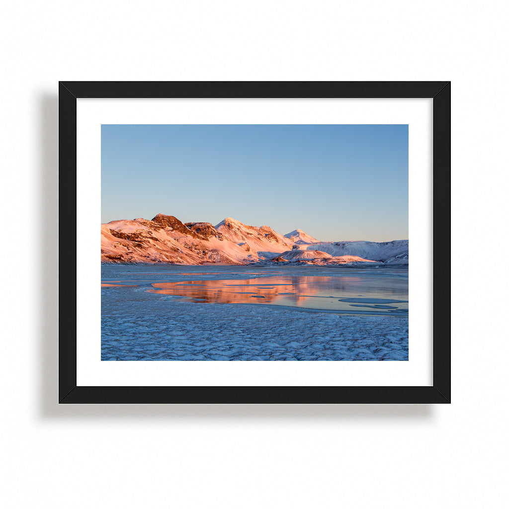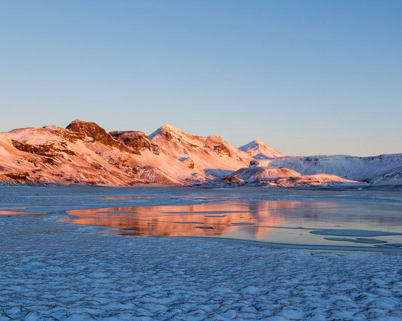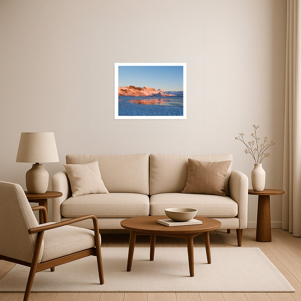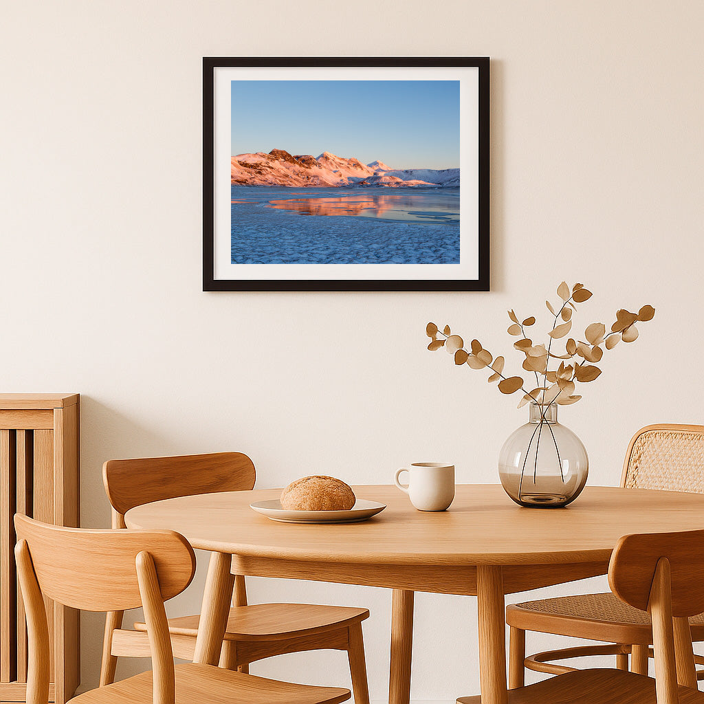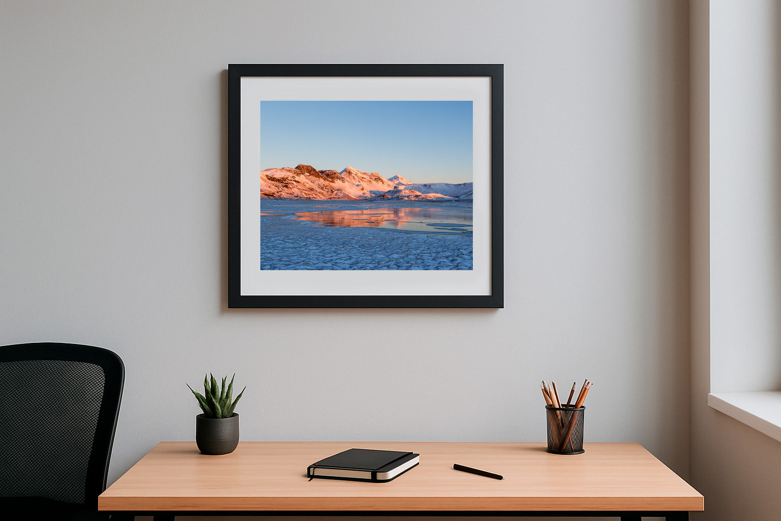 Bathed in the gentle glow of a low winter sun, the snow-capped mountains radiate soft hues of rose and gold, their rugged forms mirrored in the icy expanse below. The frozen lake, etched with delicate patterns, stretches toward the horizon, reflecting the tranquil beauty of the untouched wilderness. Each peak stands resolute, sculpted by time and weather, while the serene sky above hints at the quiet promise of a new day. In this harmonious scene, the interplay of light and shadow celebrates the silent grandeur of nature’s northern realms.