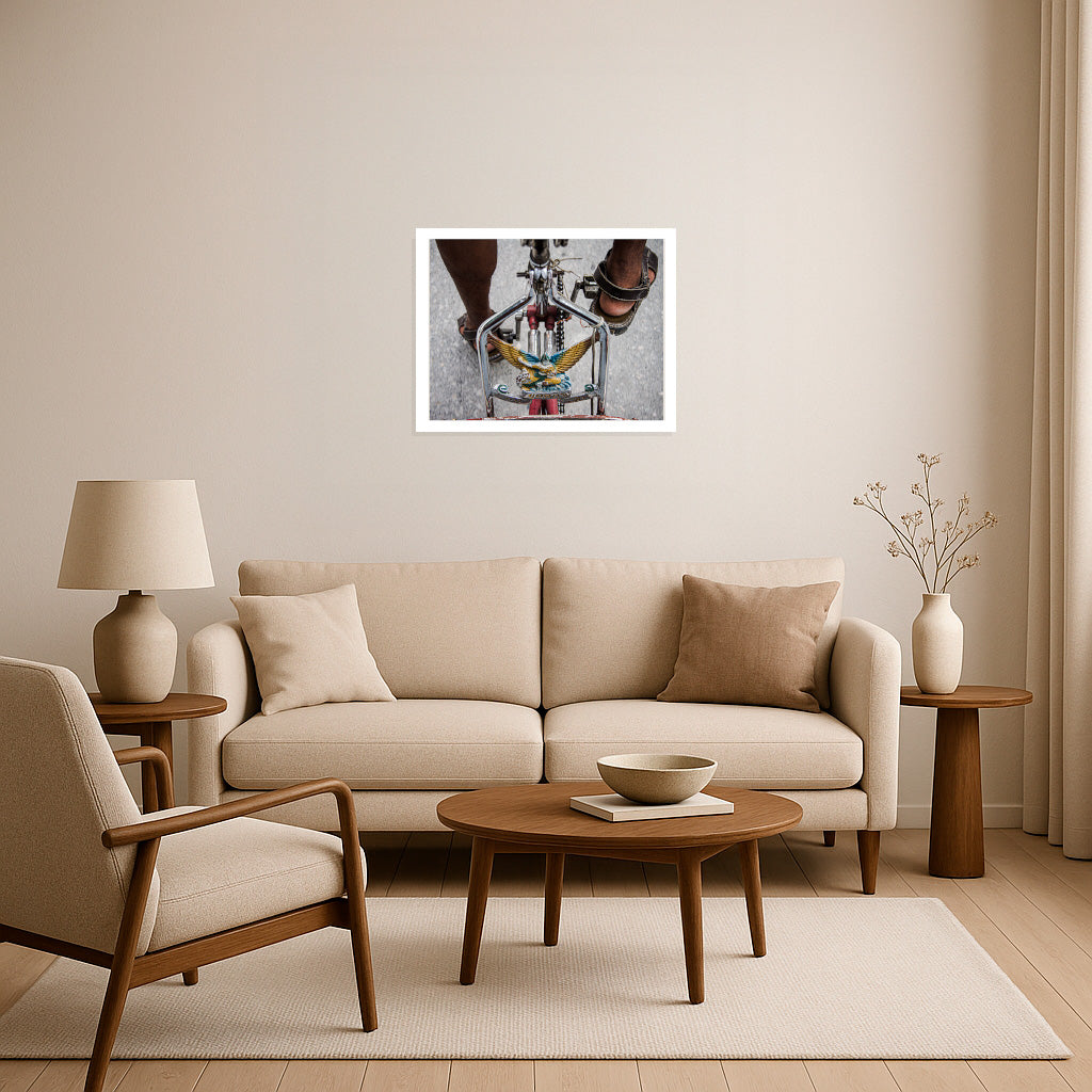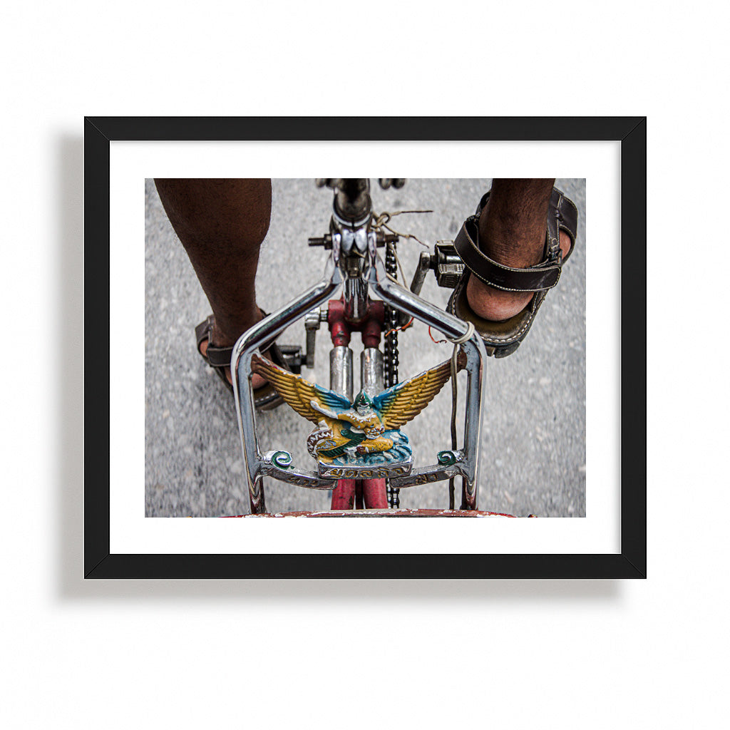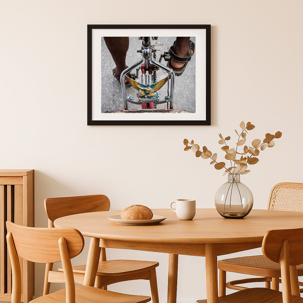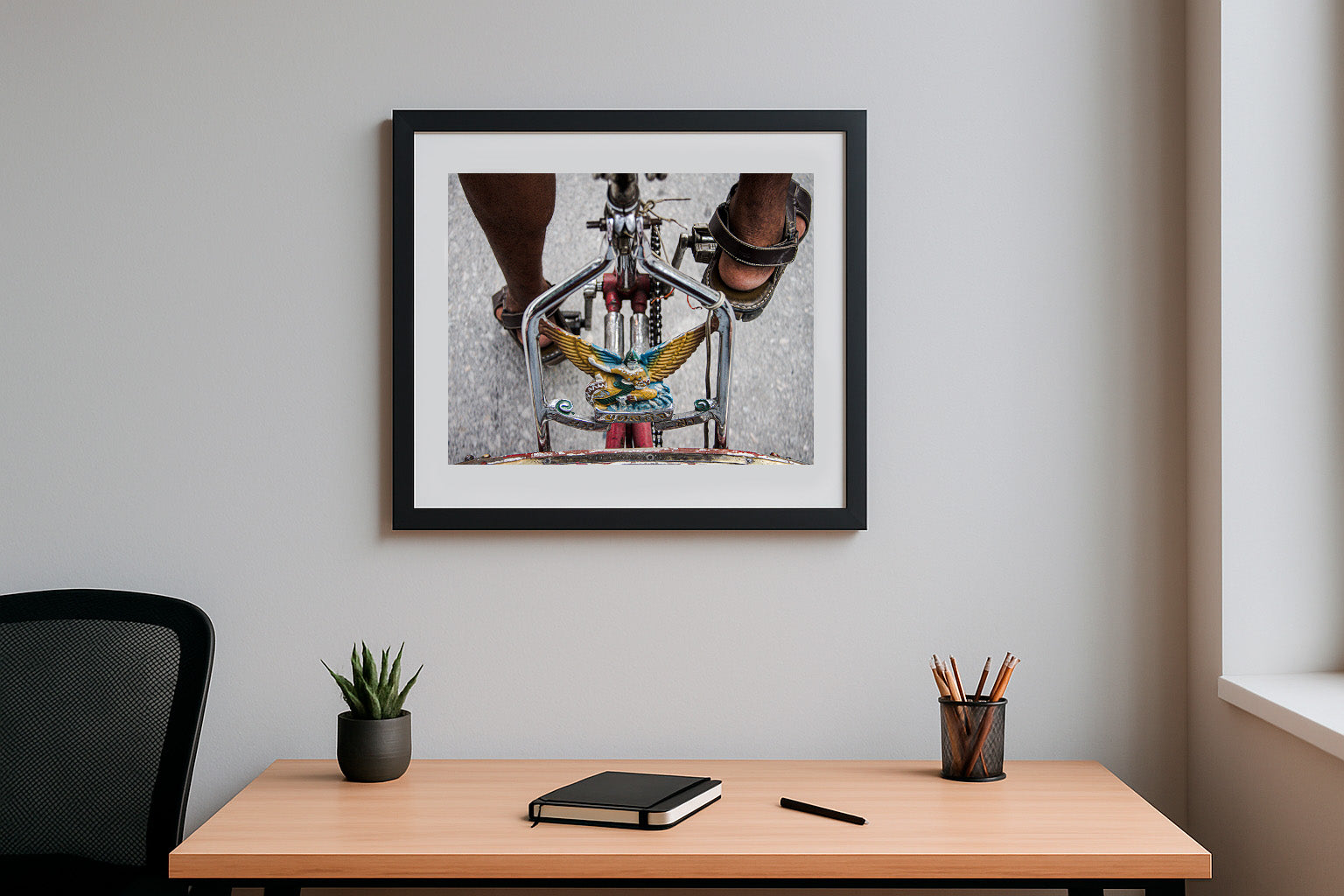 Amidst the bustling rhythm of city life, “Wings of the Street” captures the grounded strength and quiet pride of a cyclist in motion. The camera peers down from above, revealing weathered sandals gripping old metal pedals and highlighting a vibrant emblem—an eagle with majestic wings—at the heart of the bicycle’s frame. This bold figurehead, radiating with stories of journeys past, is a fitting symbol for the resilience and spirit of the everyday rider. Together, the human and the machine ride forward, undeterred by the passage of time, as the streets hum beneath their feet and the world continues to rush by.